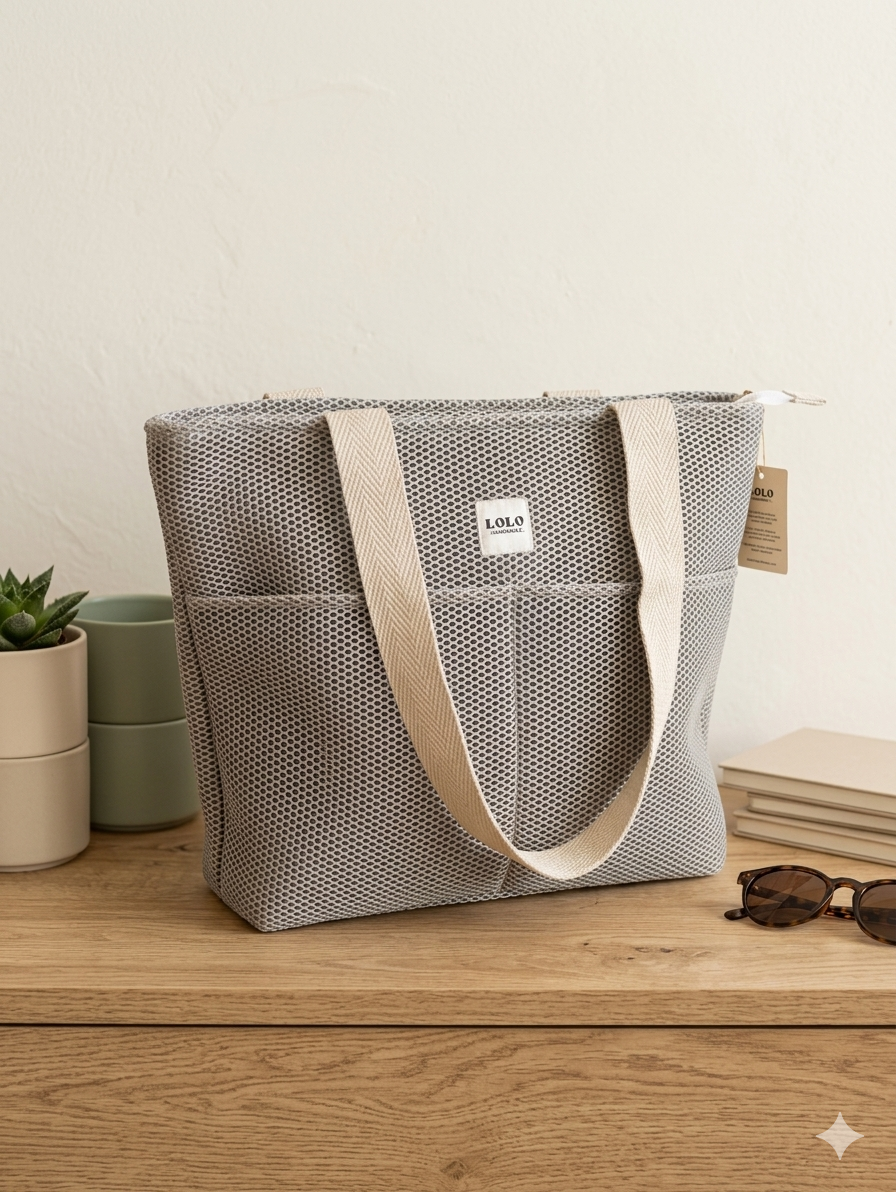 Bolso estilo shopper en malla 3D, en el exterior del bolso tiene 2 bolsillos con bastante capacidad y en el interior tiene 1 bolsillo doble con cremallera.