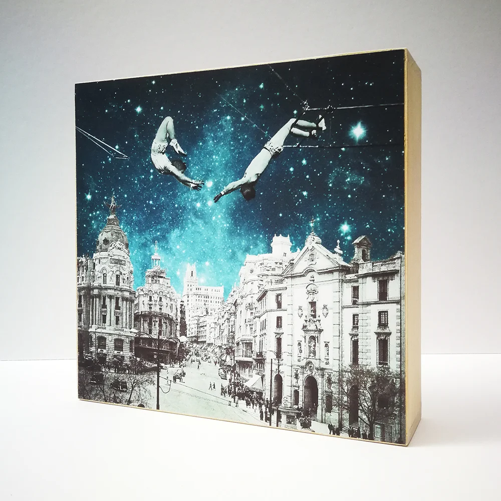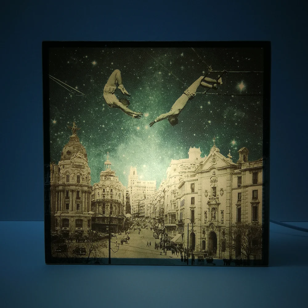 La pantalla de la lámpara es de papel y la estructura de la caja está realizada en madera. La tapa posterior es de cartón rígido blanco y tiene una apertura por la que acceder fácilmente a la bombilla.