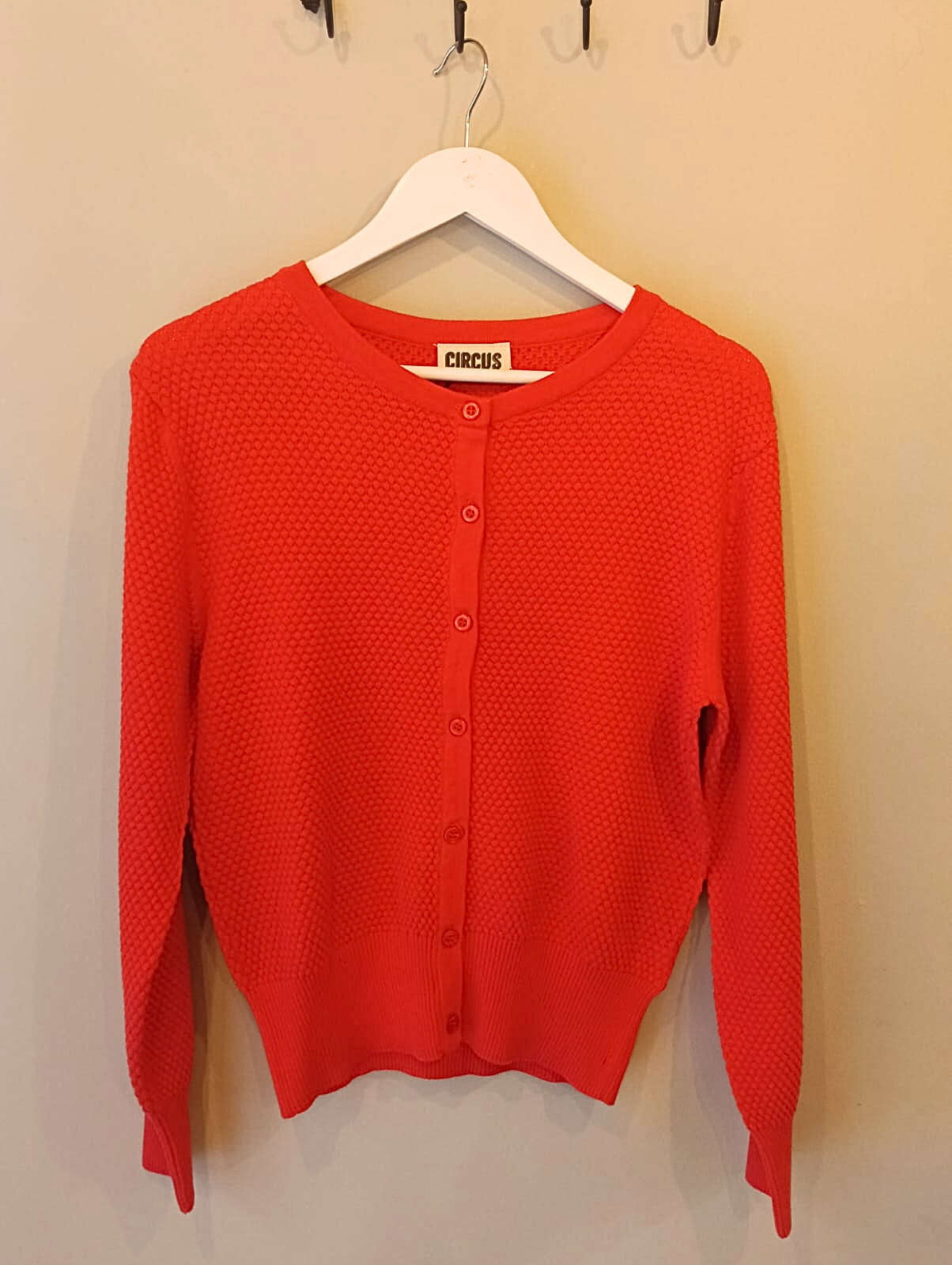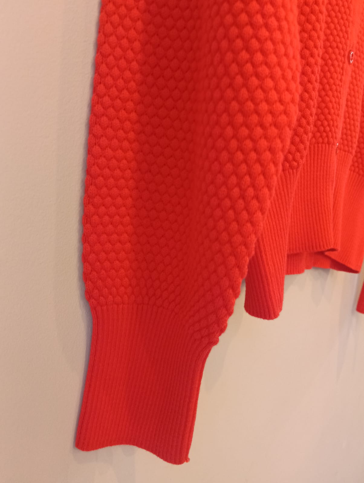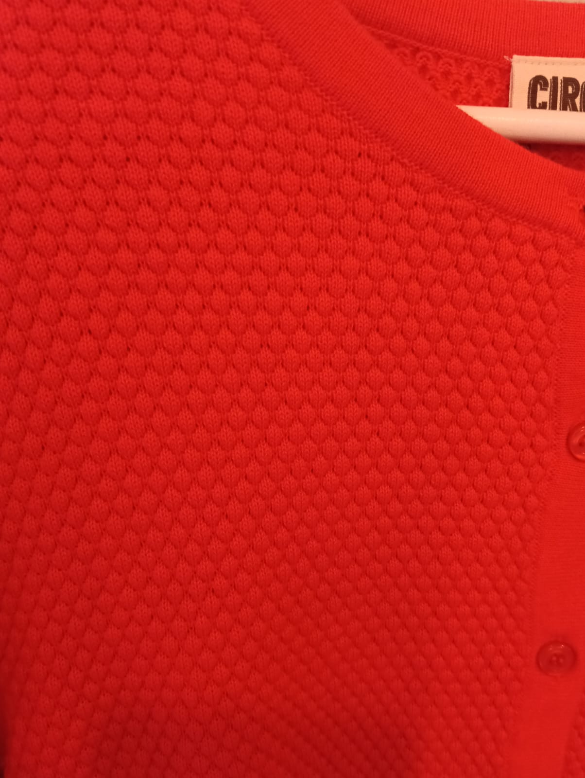 Su tono hibisco —entre cereza vibrante y rojo luminoso— aporta un toque de energía a cualquier look. Presenta cuello redondo, cierre frontal con botones y un delicado tejido con textura que eleva la prenda con sutileza.