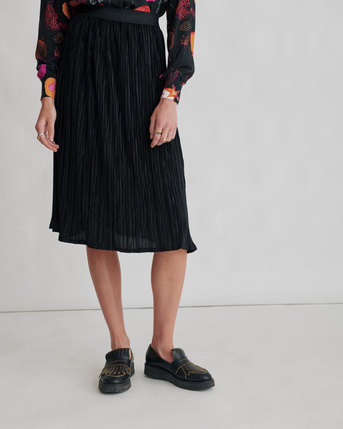 Una falda ligera y elegante en un tejido plisado de color negro. Su tejido es una maravilla, muy suave y agradable. Su cinturilla es un cinta elástica brillante que le da un toque atrevido. Combínala para sacarle el máximo partido para tu día a día como para tus ocasiones más festivas.