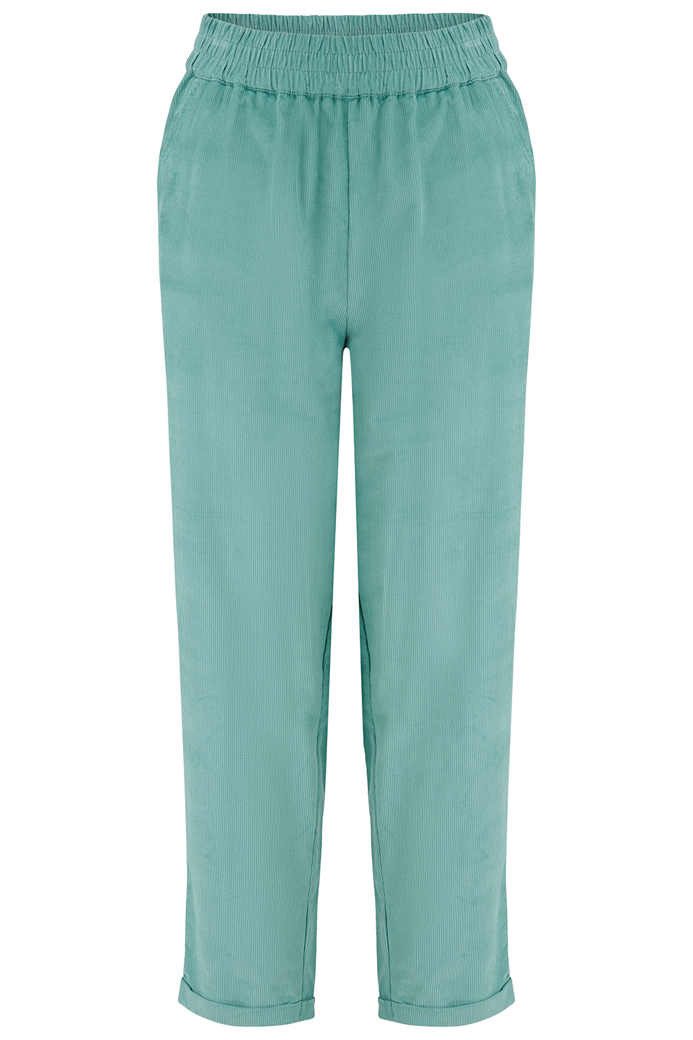 Disfruta de la comodidad sin esfuerzo con los pantalones Vonnie en suave pana color verde azulado. Hechos 100 % algodón, estos pantalones informales tienen una pernera holgada y ligeramente cónica, y una cintura elástica para un ajuste perfecto. La suave textura de pana les da un toque sofisticado a la vez que informal. Llévalos con botas o con tu camiseta y zapatillas favoritas: Vonnie está hecho para ir a cualquier parte.