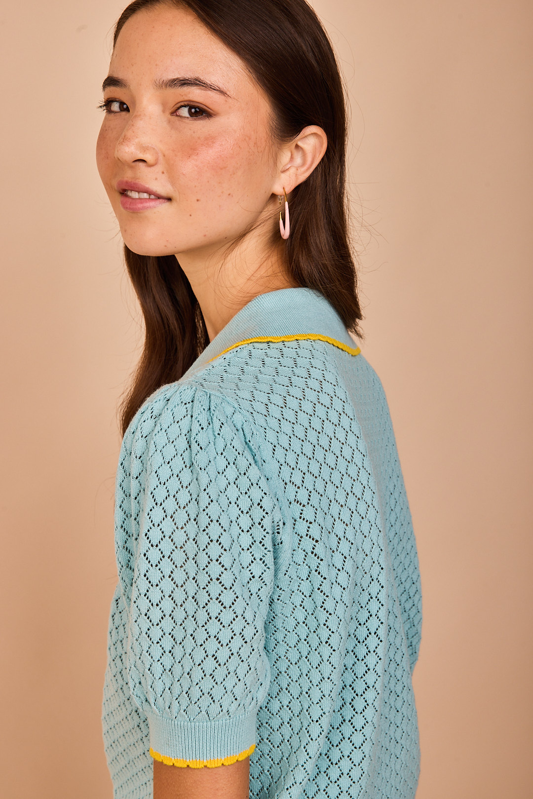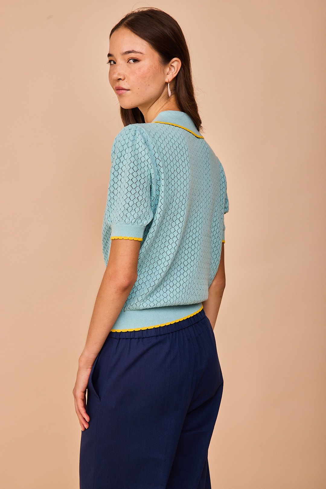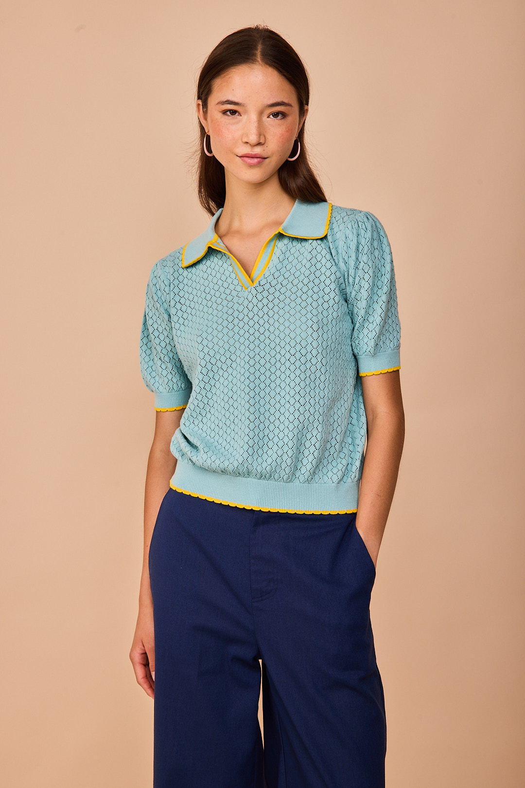 Polo de punto calado en un luminoso tono turquesa, ligero y delicado, perfecto para los días de entretiempo. Los ribetes en contraste aportan un toque alegre y especial que realza su estilo femenino y fácil de combinar.