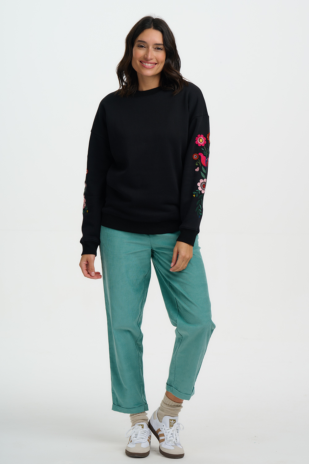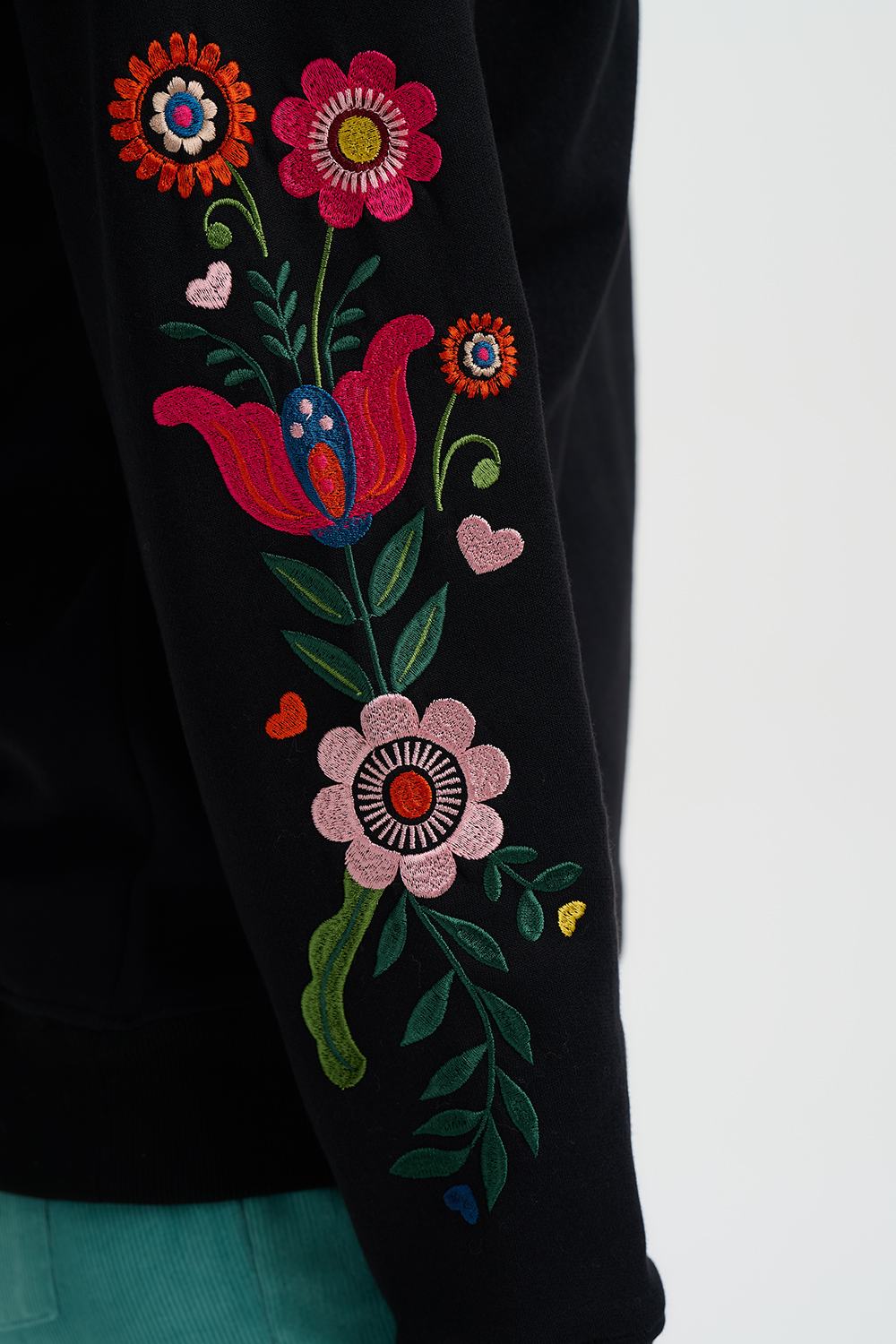 Presenta cuello redondo y un vibrante estampado floral de inspiración folk, con pétalos superpuestos, tallos con hojas y pequeños corazones dispuestos en un motivo vertical decorativo sobre base negra.