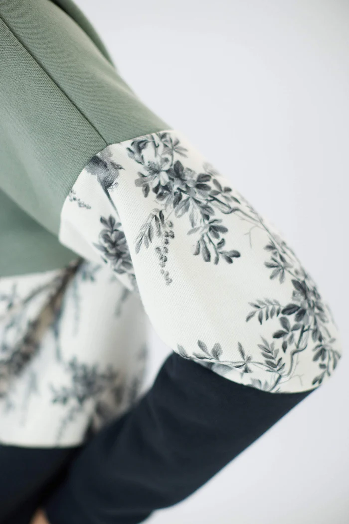 Confeccionado con el característico bloque de color, la parte superior es menta, seguida de un bloque con estampado de colibrí y un espectacular bloque azul grisáceo oscuro en la parte inferior. Un suéter con personalidad para un conjunto divertido y moderno. ¡Llévalo con tus vaqueros y tus zapatillas favoritas! Una prenda que grita «¡Ya llegó el otoño!».