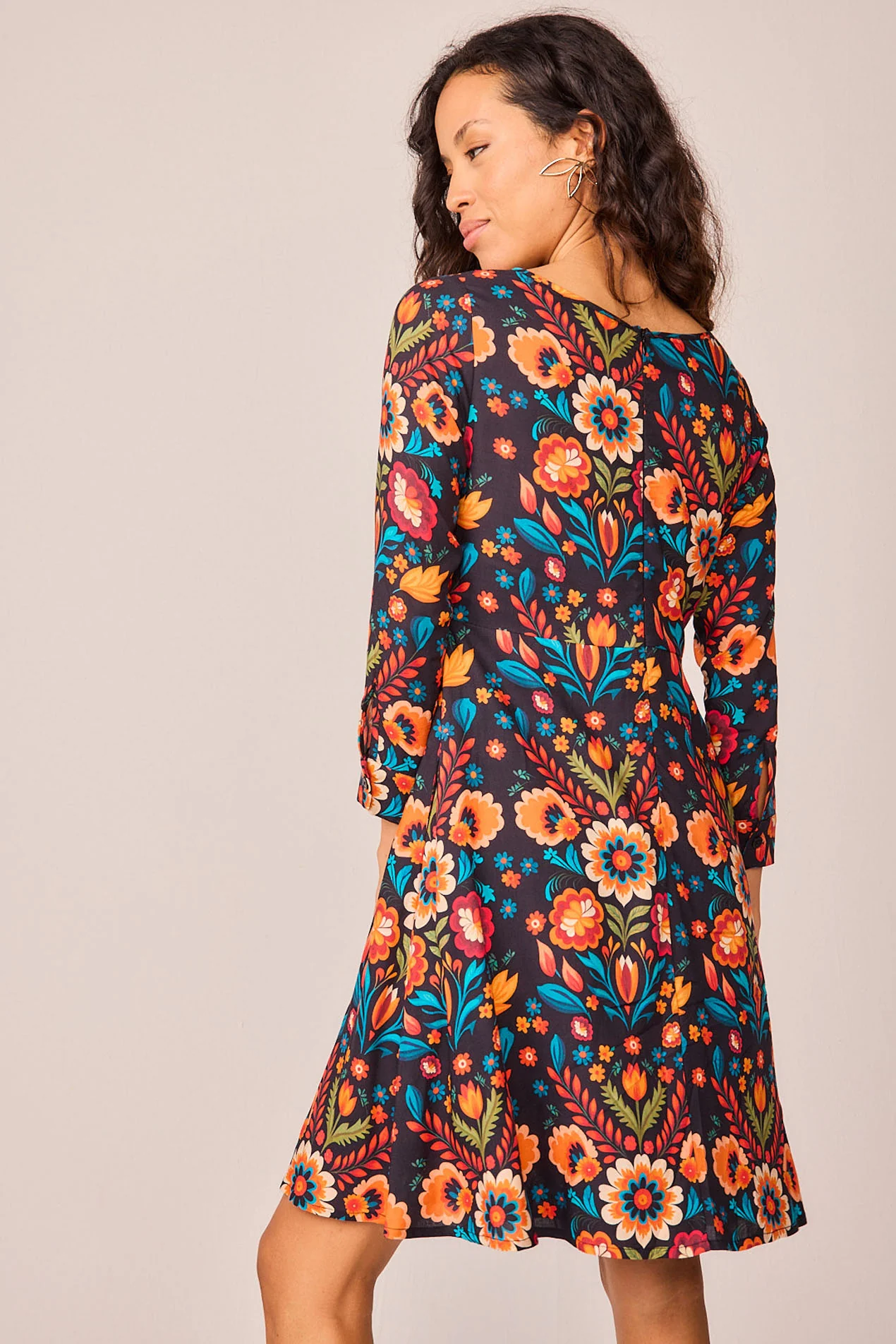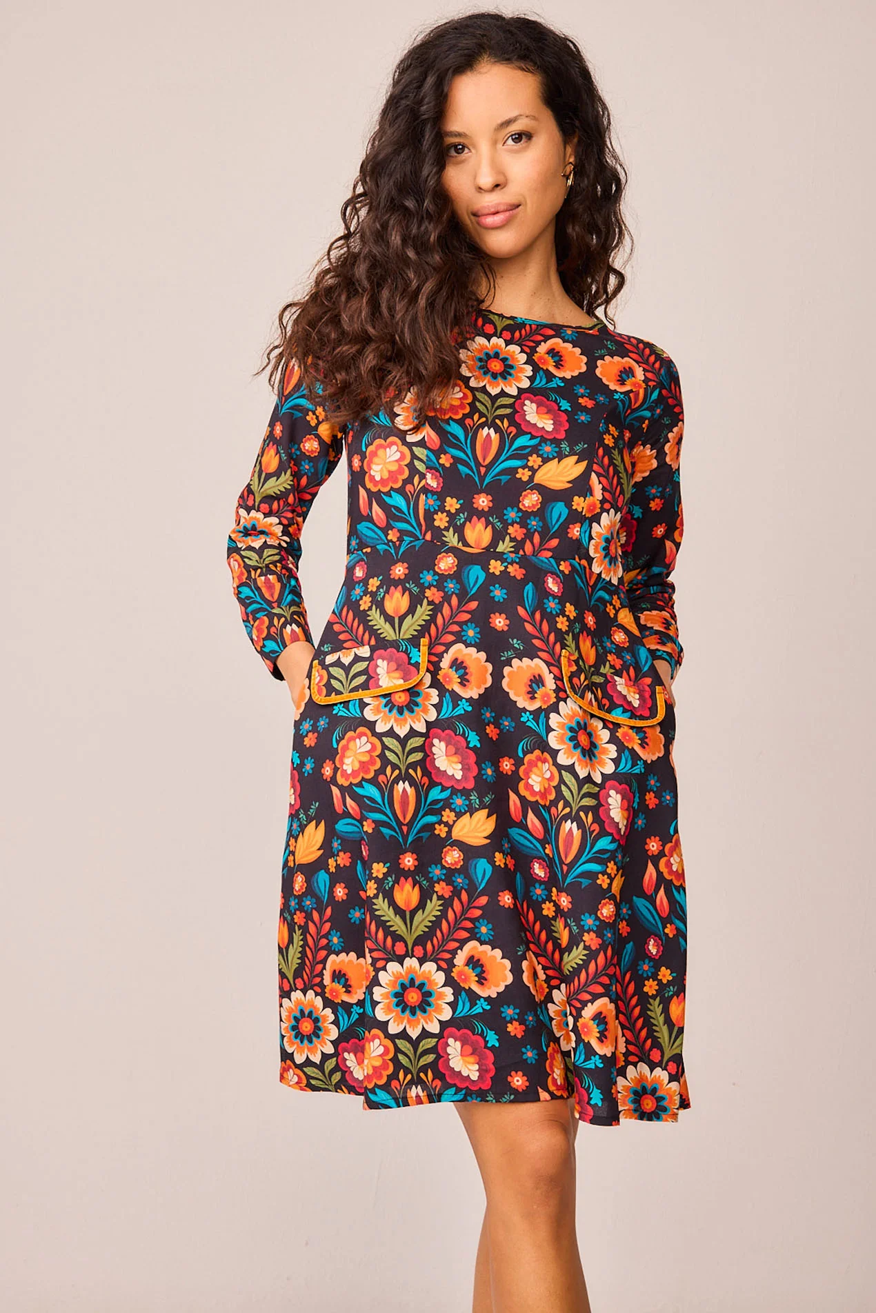 Vestido corto con cuello barco, cuerpo pegadito y falda capa con forro de algodón. Lleva dos bolsillos decorativos con un detalle de terciopelo, además lleva bolsillos invisibles. El vestido es completamente precioso.